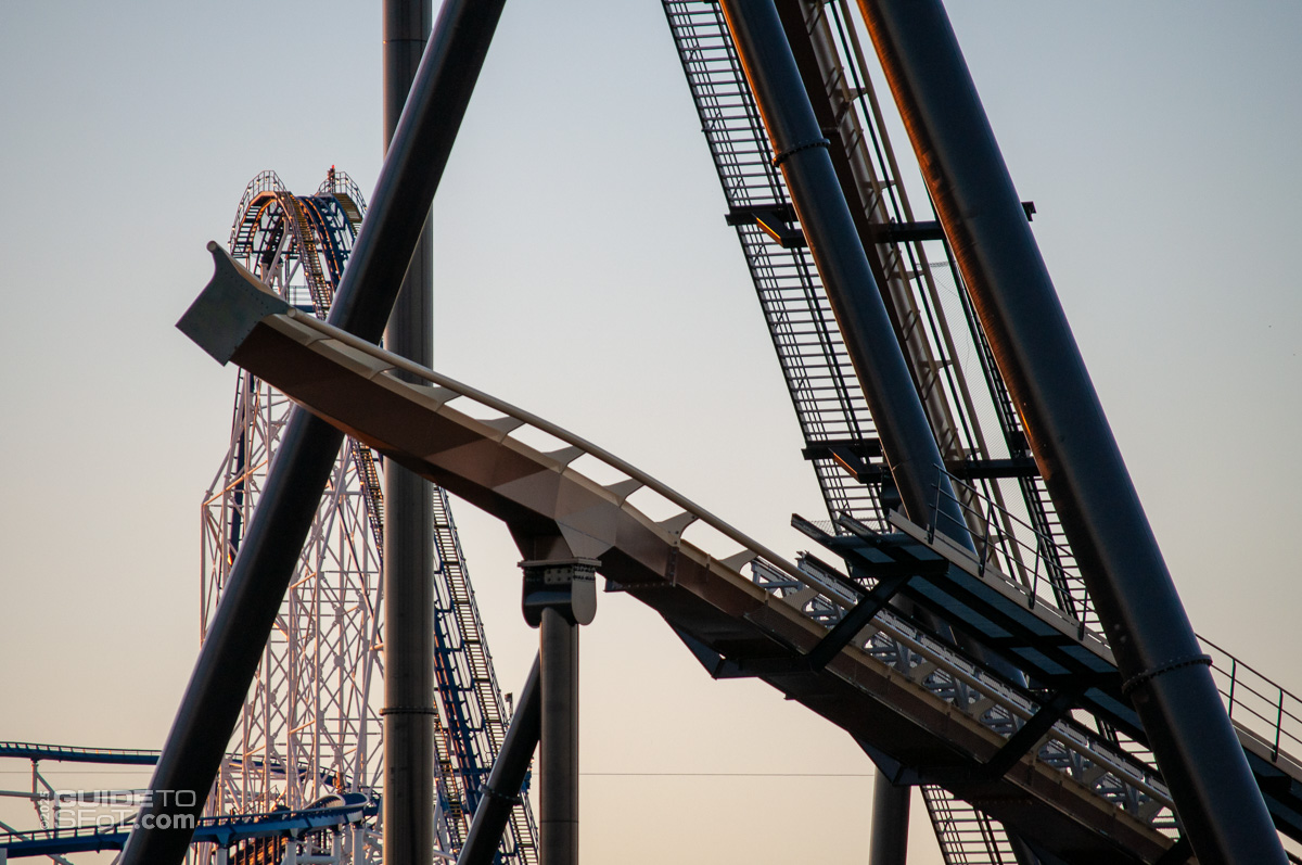 Riders enjoy the view at the top of the lift, but only for a moment. As the train makes a left turn toward the first drop, it is brought to a brief, complete stop by the holding brake. Anyone who claimed not to fear heights may find themselves second-guessing at this point.