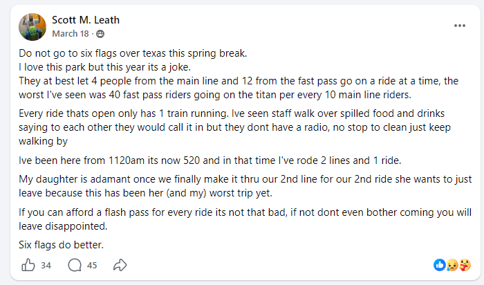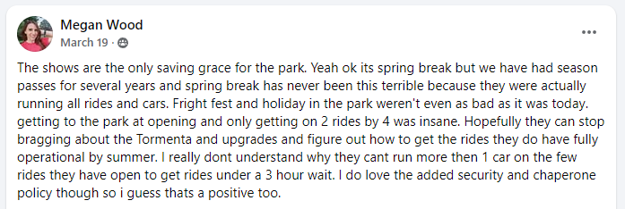 Some guests in online groups brushed off the park’s first few weeks of rocky operations as a consequence of the 2-month closure (seemingly forgetting that the park had an off-season for virtually all of its existence except for the past few years) and that all would be back to normal soon. But then came Spring Break, widely known to be one of the busiest weeks of the park. Again, guests reported significant ride closures (apparently due to staffing issues) and coasters that were open were only running single trains resulting in multiple-hour waits.