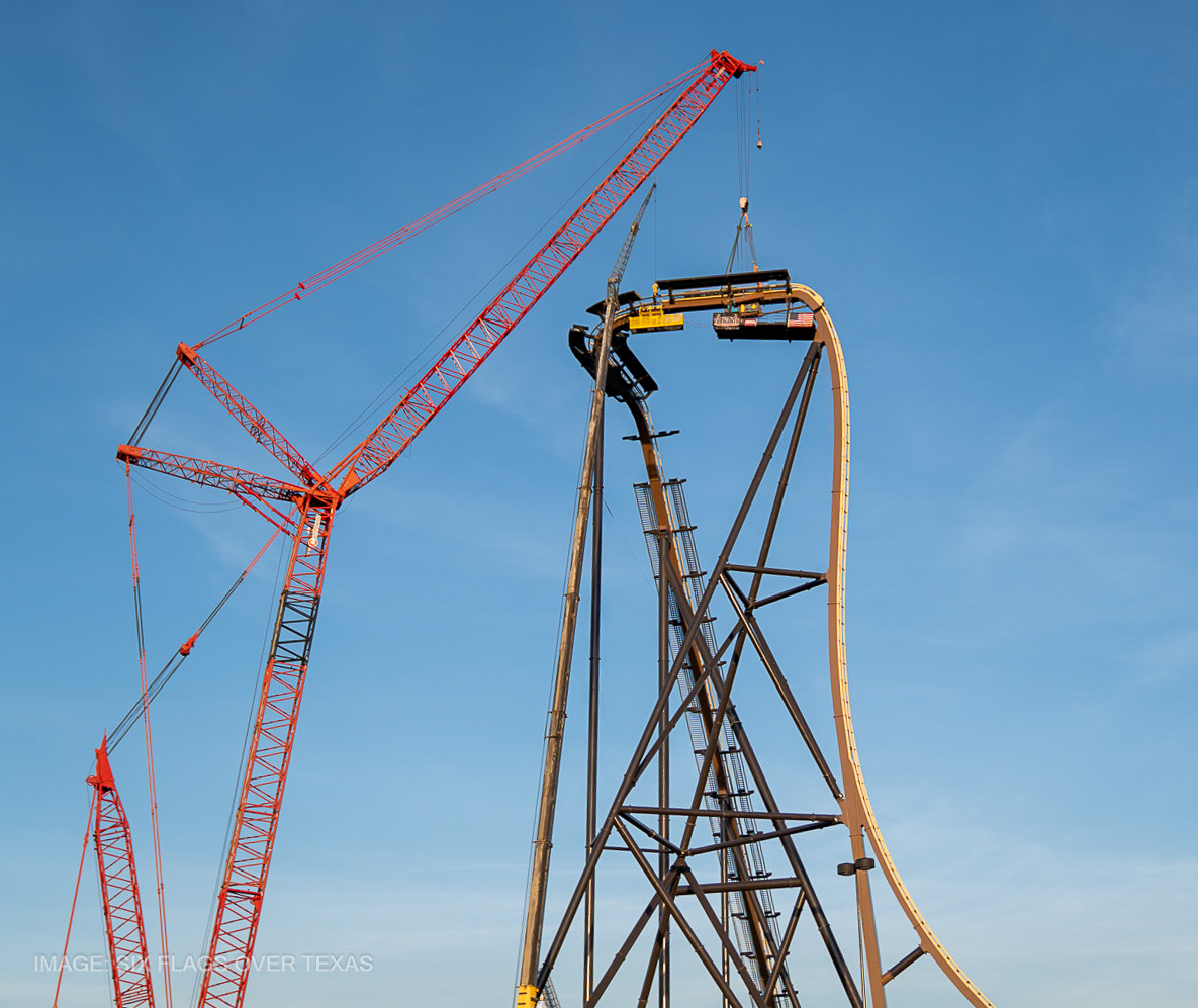 Crews installed the final track piece of the ride’s peak early the morning of December 19, 2025, joining track sections of the lift with the first drop. This milestone completes 870 feet of the ride’s total 4,199 feet of track.